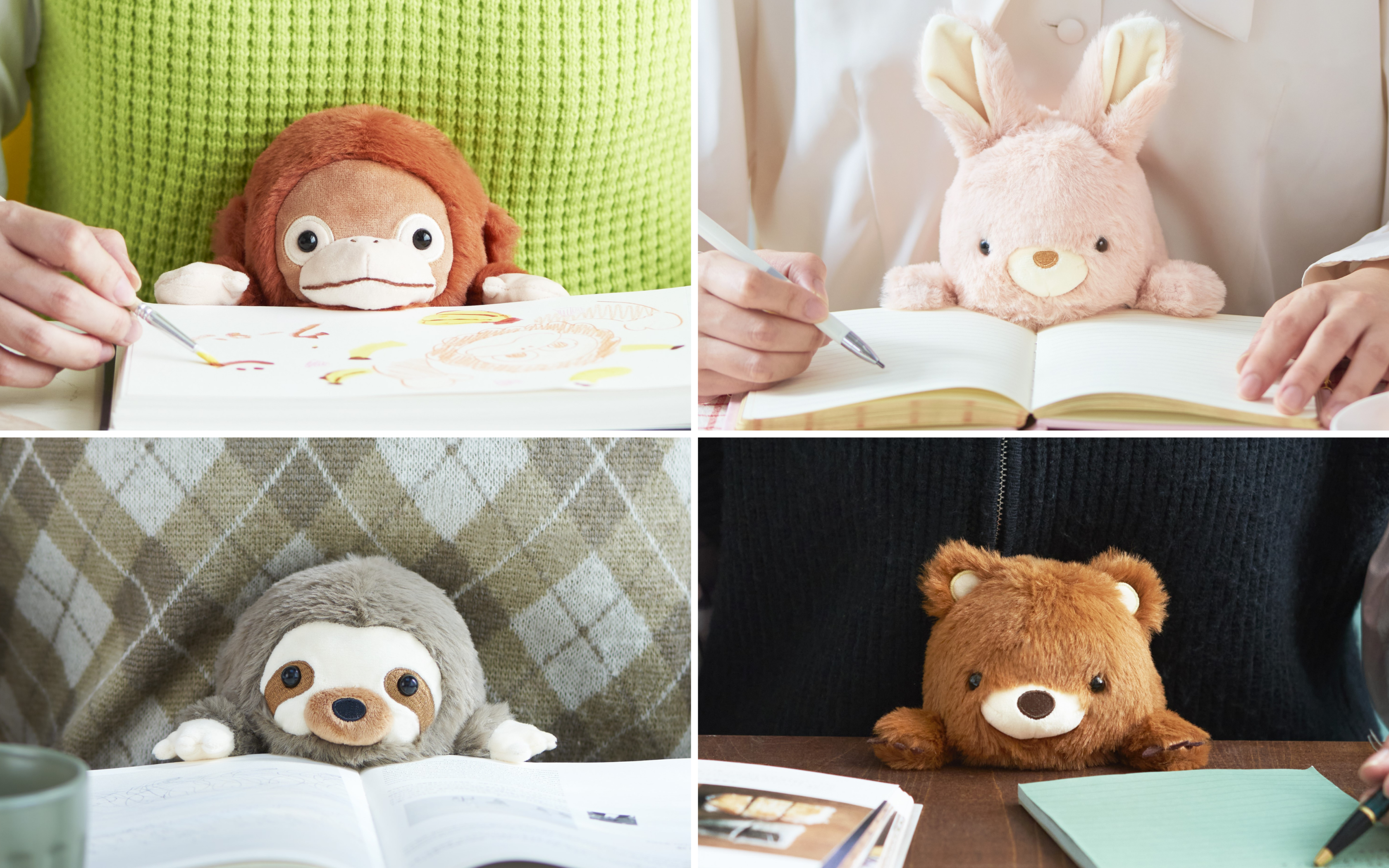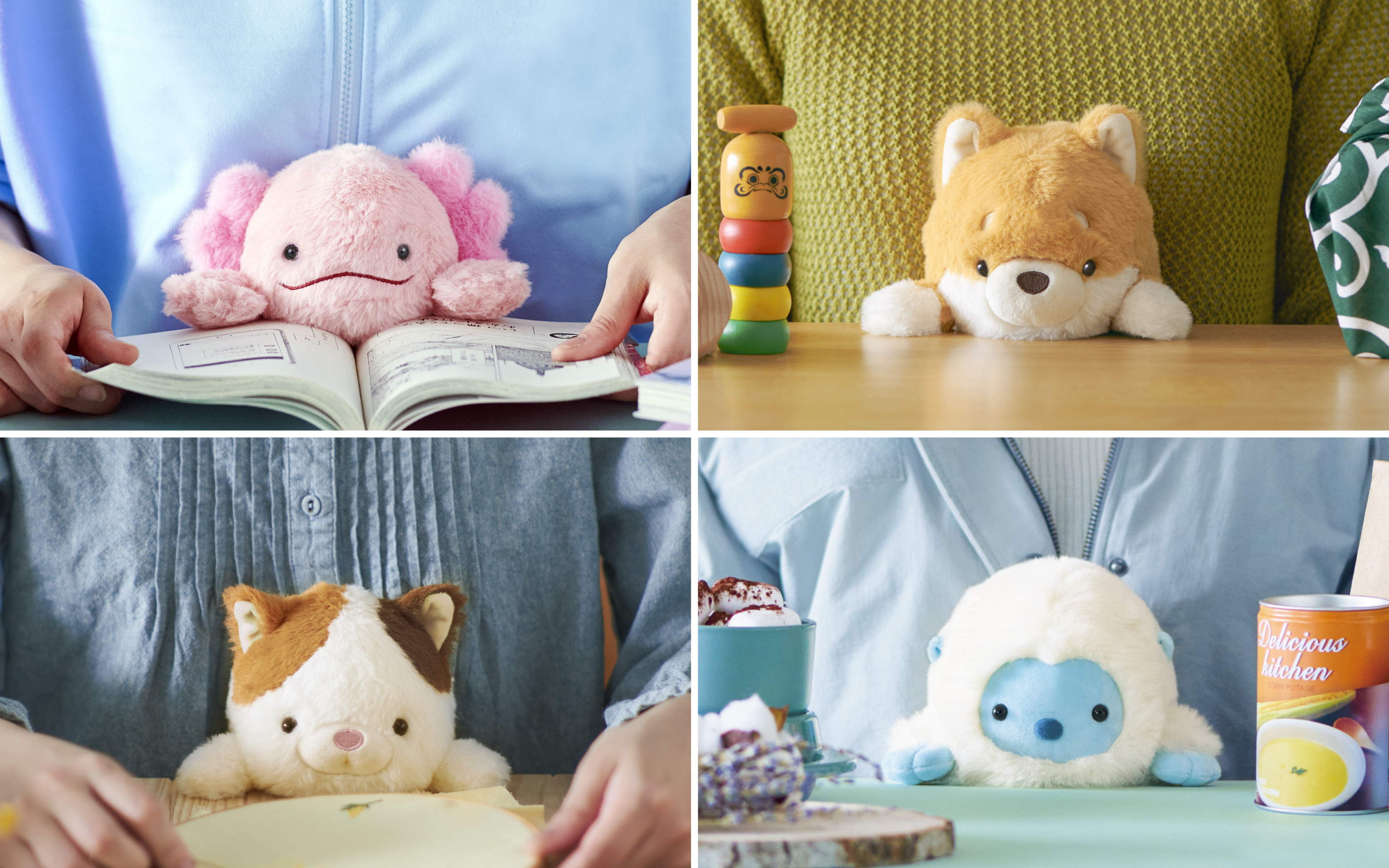 8 cuddly friends: Rabbit. Bear. Sloth. Orangutan. Axolotl. Calico Cat. Shiba Inu. and Yeti